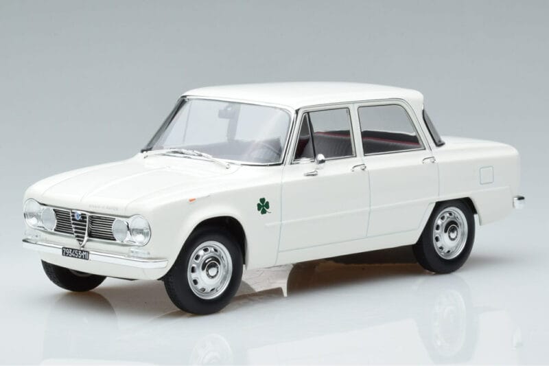 The Alfa Romeo Giulia Ti Super Norev 1:18 is crafted from Metal. Die-cast zinc alloy body with detailed plastic parts, rubber tires, and high-quality paint finish. Die-cast models are known for their weight, durability, and realistic feel.