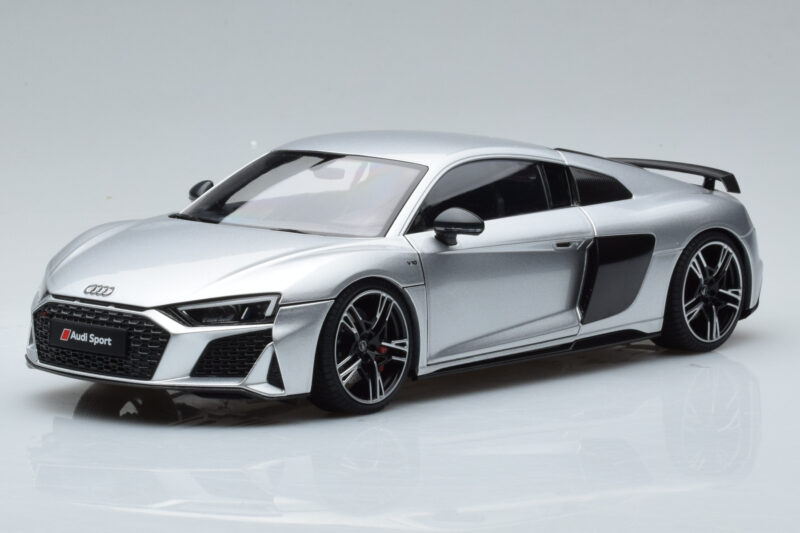 A 1:18 scale model measures approximately 25-28 cm (approximately 10-11 inches). The Audi R8 Performance Srebrny Kengfai 1:18 is perfect for display in a glass cabinet or on a shelf.