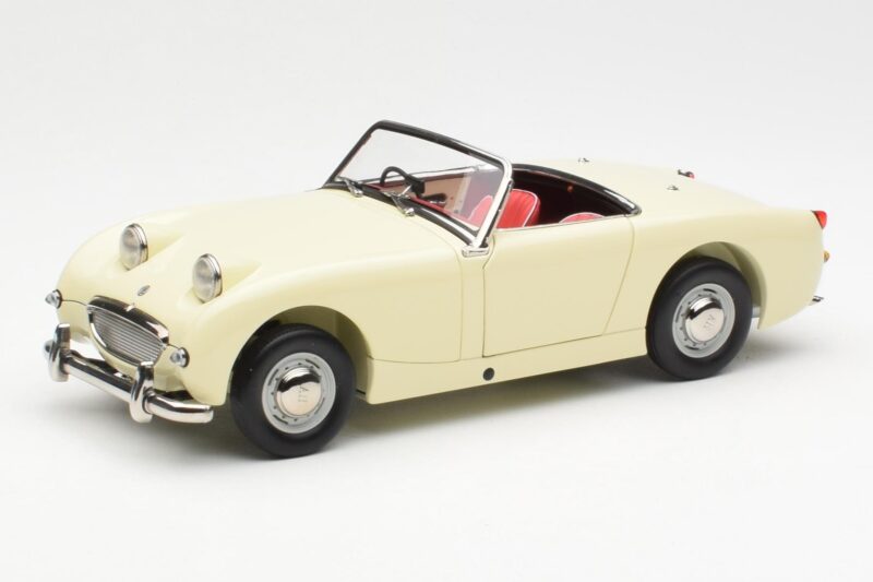 The Austin-Healey Sprite Mk I Open Old English Biały Kyosho 1:18 is crafted from Metal. Die-cast zinc alloy body with detailed plastic parts, rubber tires, and high-quality paint finish. Die-cast models are known for their weight, durability, and realistic feel.