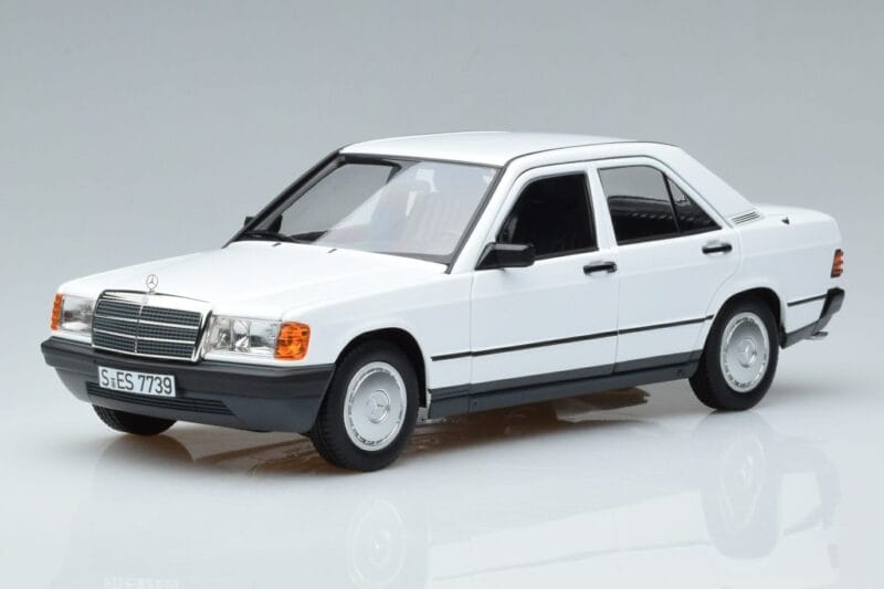 The Mercedes 190 E W201 Biały Norev 1:18 is crafted from Metal. Die-cast zinc alloy body with detailed plastic parts, rubber tires, and high-quality paint finish. Die-cast models are known for their weight, durability, and realistic feel.