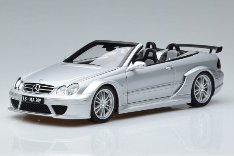The Mercedes CLK DTM AMG W209 Kabriolet Srebrny Kyosho 1:18 is crafted from Metal. Die-cast zinc alloy body with detailed plastic parts, rubber tires, and high-quality paint finish. Die-cast models are known for their weight, durability, and realistic feel.
