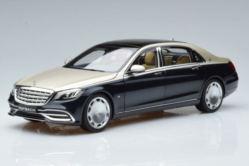 The Mercedes Maybach S650 X222 Srebrno-Niebieski Norev 1:18 is crafted from Metal. Die-cast zinc alloy body with detailed plastic parts, rubber tires, and high-quality paint finish. Die-cast models are known for their weight, durability, and realistic feel.
