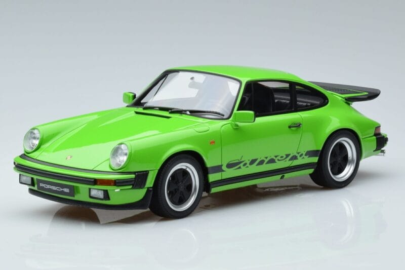 A 1:18 scale model measures approximately 25-28 cm (approximately 10-11 inches). The Porsche 911 3.2 Carrera Limonkowy GT Spirit 1:18 is perfect for display in a glass cabinet or on a shelf.