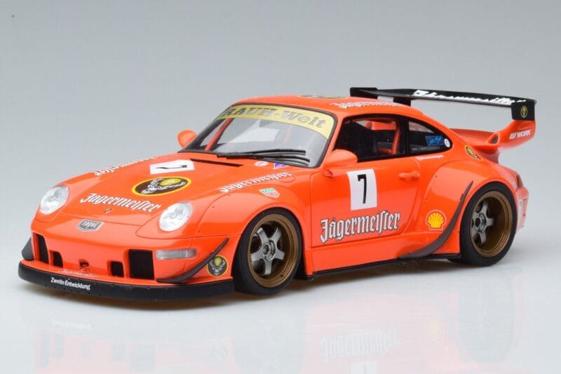 The Porsche 911 993 RWB Jagermeister Asia Edition GT Spirit 1:18 is crafted from Żywica. High-quality resin with hand-painted details and limited production runs. Resin models offer exceptional detail and are prized by serious collectors for their craftsmanship.